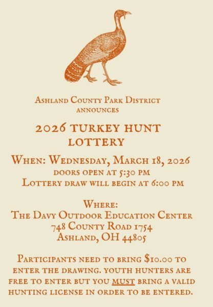 The Ashland County Park District is excited to announce the 2026 Turkey Hunt Lottery, giving local hunters a chance to secure a spot for this year’s hunt.