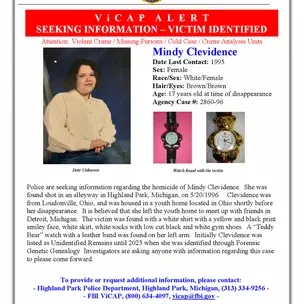 Highland Park Police Detectives are still looking for anyone that knew Mindy Clevidence, friends that may have talked to her in 1996, or other kids at the group home who may know who she left with. Please, if you want to provide or request additional information, please contact: Highland Park Police Department, Highland Park, Michigan, (313) 334-9256 or FBI ViCAP, (800) 634-4097