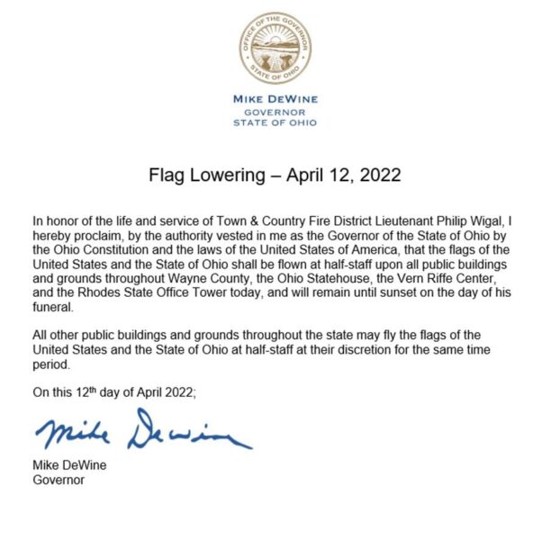 Following his death, Governor Mike DeWine ordered flags to be flown at half-staff across Wayne County and at state buildings in Columbus in honor of Lt. Wigal, a tribute reserved for those who have made the ultimate sacrifice.