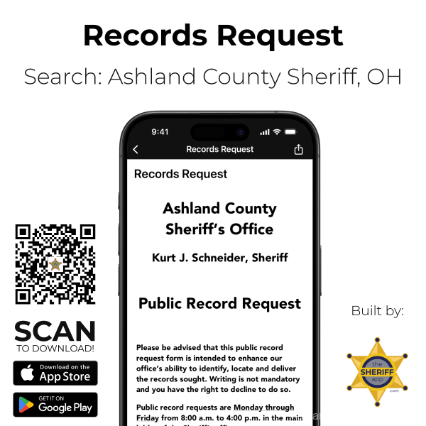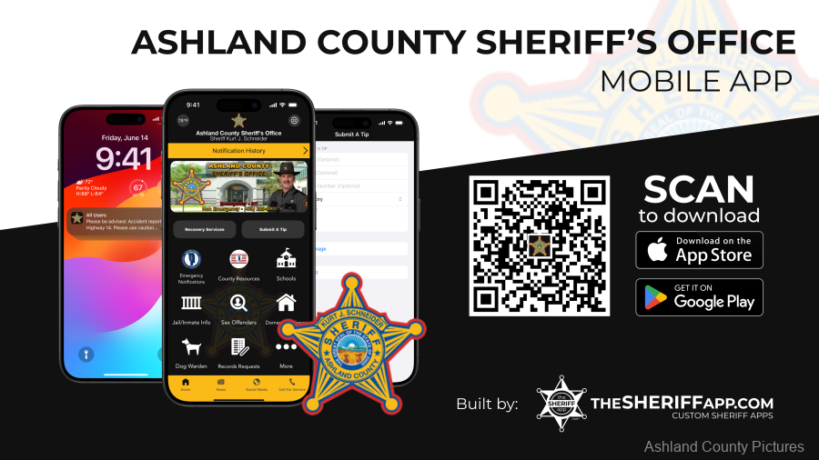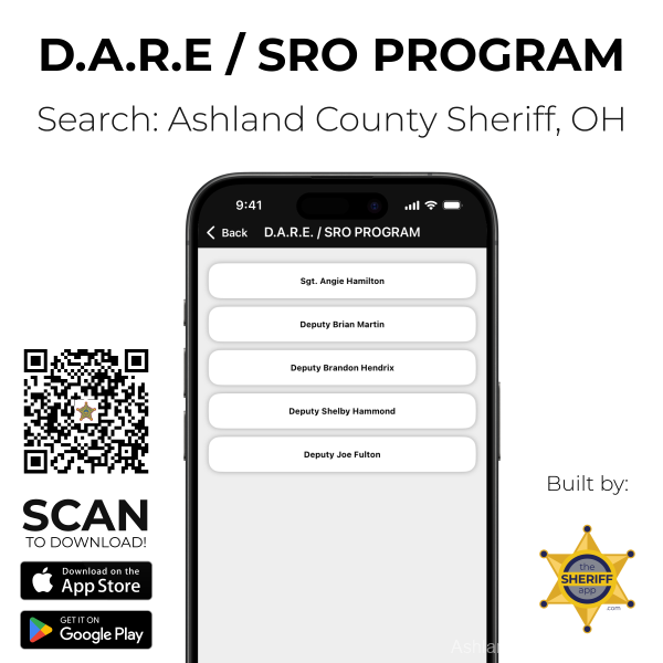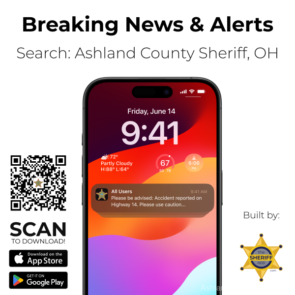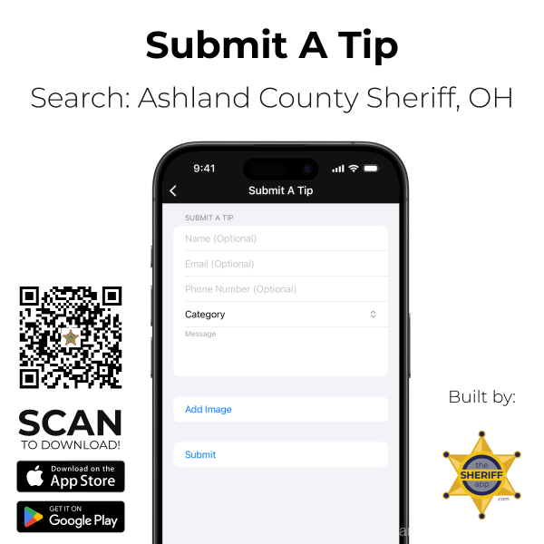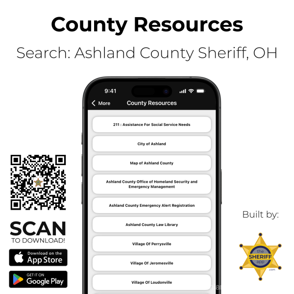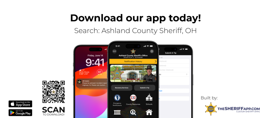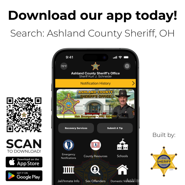 Download the free app from your smartphone’s app store (search for the Ashland County Sheriff’s Office).