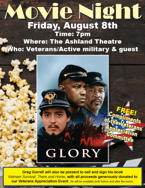 The festivities begin on Friday, August 8, with a special FREE movie night exclusively for veterans, active-duty military, and one guest each. The showing of the Civil War epic “Glory” will take place at 7 p.m. at The Ashland Theatre, courtesy of the Veterans Appreciation Committee.