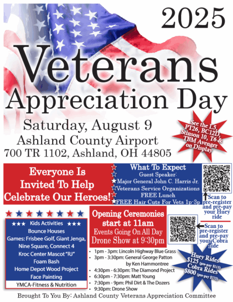 ASHLAND, OH – The skies above Ashland County Airport will thunder and glow on Saturday, August 9, 2025, as the Ashland County Veterans Appreciation Committee presents its annual Veterans Appreciation Celebration, a free, daylong event honoring the men and women who have served in the U.S. Armed Forces.