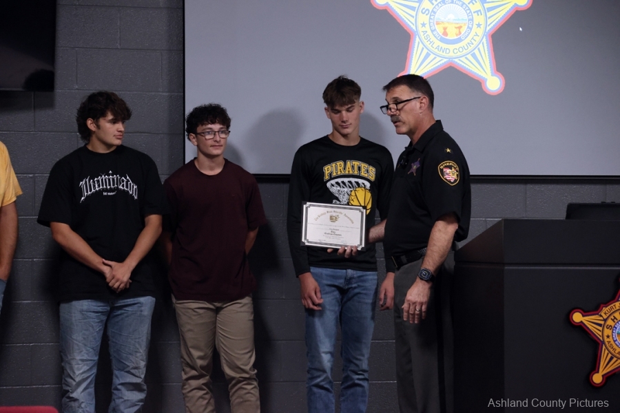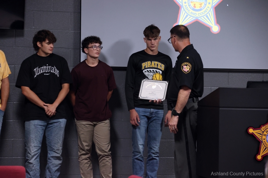 Sheriff Schneider, of the Ashland County Sheriff’s Office, presented awards to students Zane Bungard, Chase Gallagher, and Trenton Delesky, along with coaches Andrew Brodwolf, Michael Hazlett, Aaron Munyan, and Kyle Clark, during a ceremony held at the Sheriff’s Office Annex.