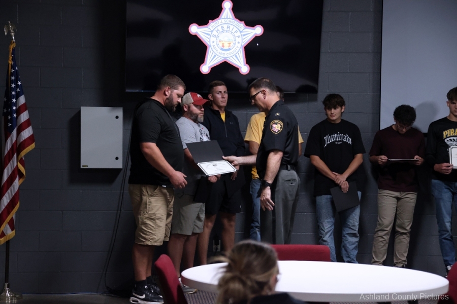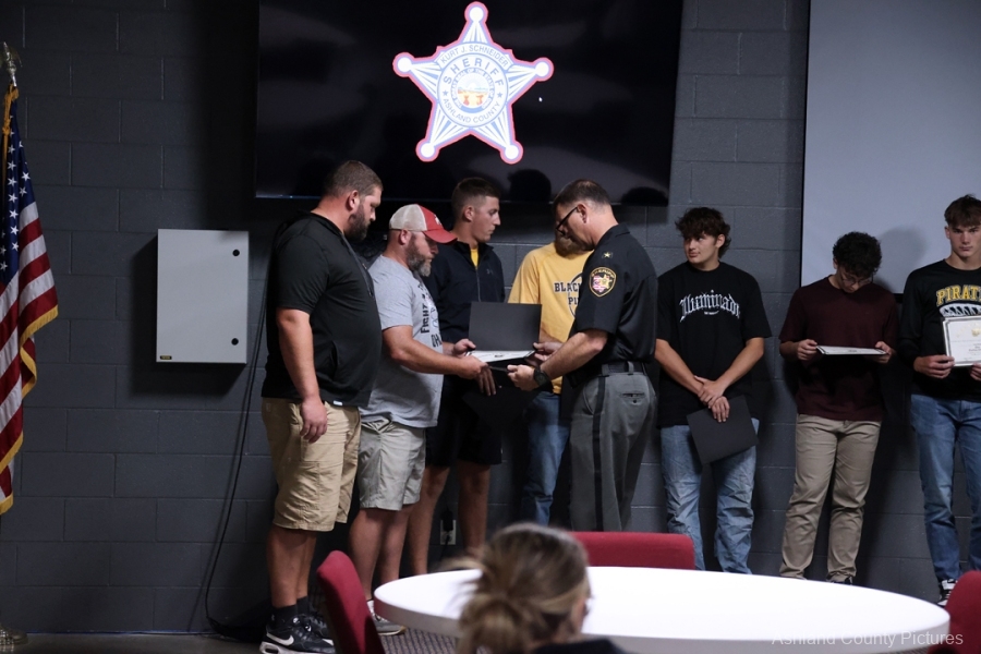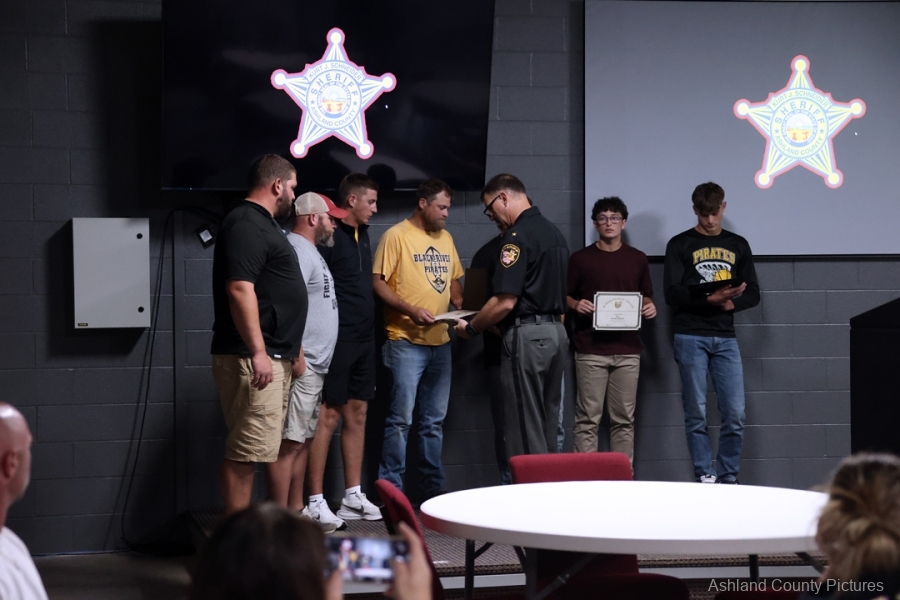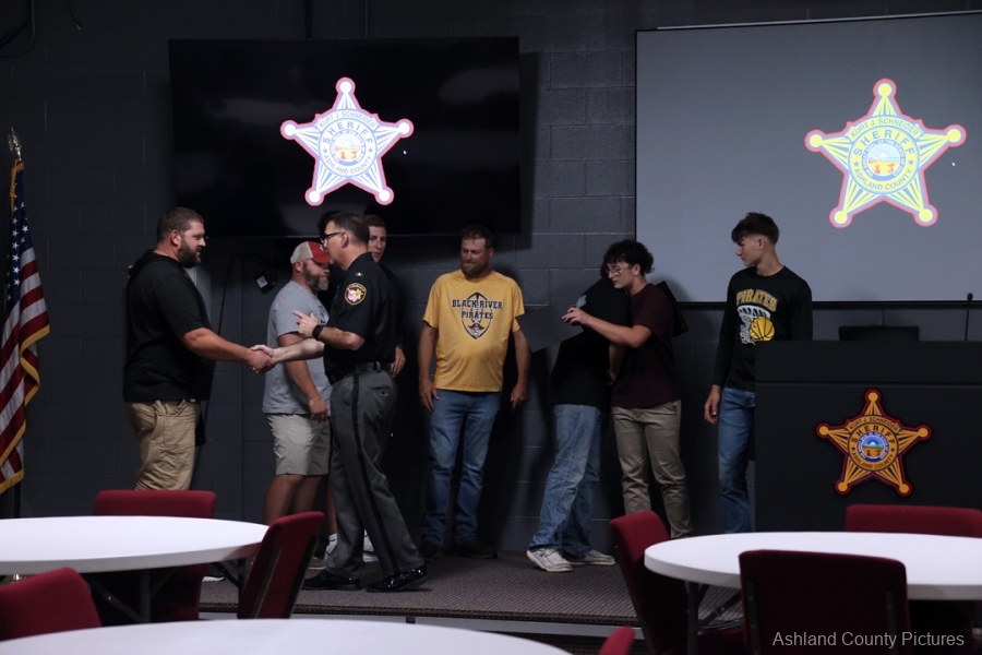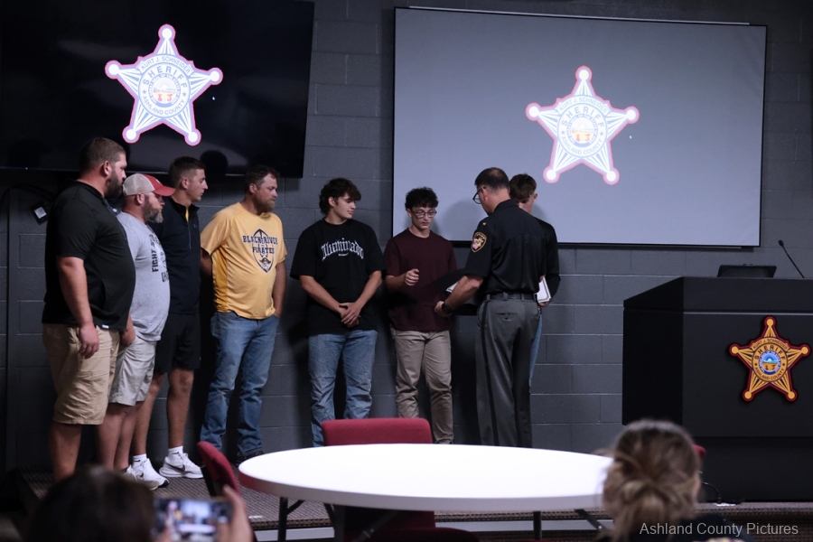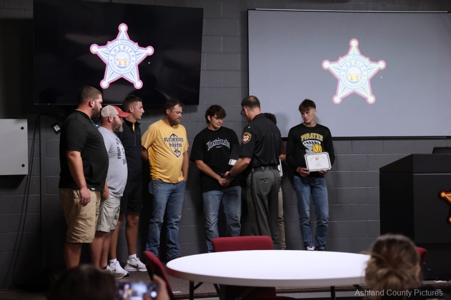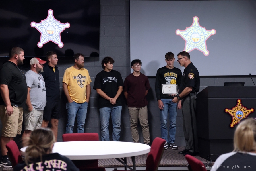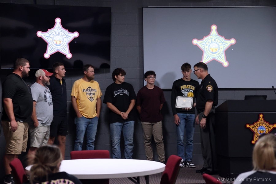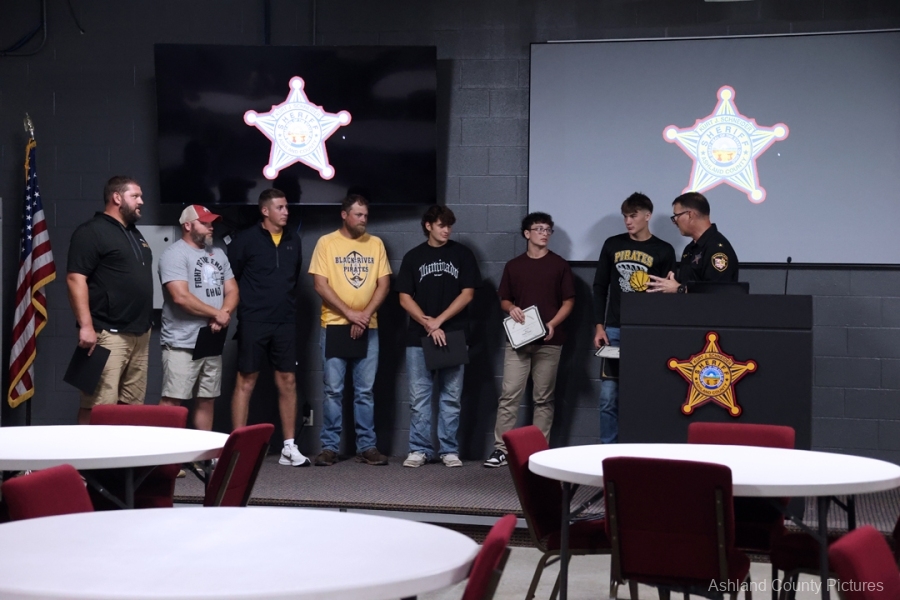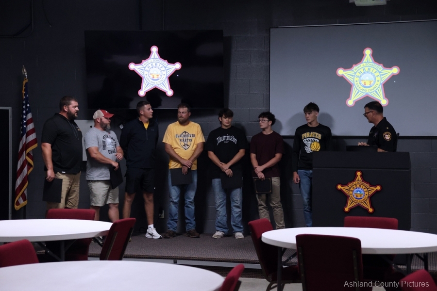 ASHLAND – A group of Black River High School football players and their coaches were recognized Thursday evening by Ashland County Sheriff Kurt J. Schneider for their lifesaving actions during a summer team gathering.