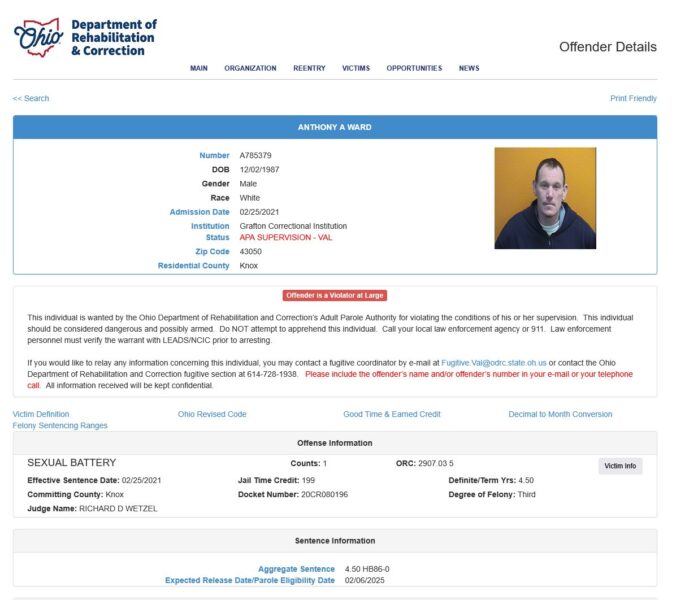 The July 11 incident, now the subject of viral surveillance footage and a Richland County Prosecutor review, left 37-year-old Anthony Ward with a broken leg after he bolted from Butler Police Chief Eric Winbigler during a warrant arrest. Ward, as it turns out, wasn’t just any fugitive — he was wanted by the Ohio Department of Rehabilitation and Correction’s Adult Parole Authority as a Violator at Large, considered “dangerous and possibly armed.” Ward had been imprisoned in 2021 after being convicted of sexual battery of a minor, a third-degree felony, and violated the conditions of his supervision.