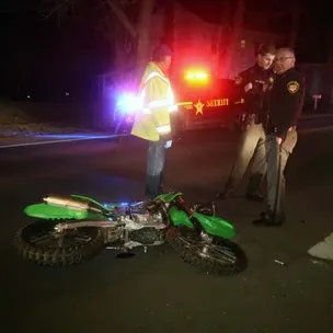 The driver of the 2021 Kawasaki Dirt Bike was cited due to the fact he had an off road motorbike with no lights, or tags on a State Highway, Assured Clear Distance Ahead (ACDA), No motorcycle endorsement.