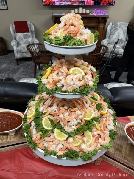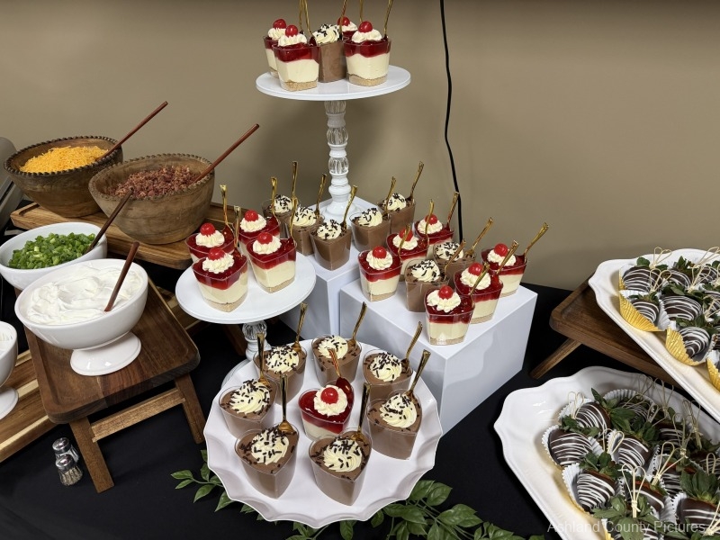 Catered by Immeasurably More, the optional buffet featured a dramatic Shrimp Cocktail Tower, tender beef medallions with mushroom cream sauce, garlic-butter shrimp skewers, baked potatoes with all the fixings, bacon-wrapped asparagus, fresh salads, and decadent Valentine-themed desserts.