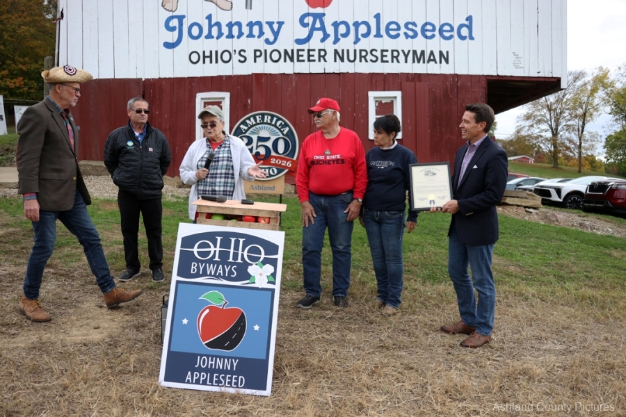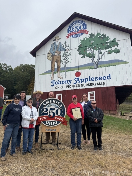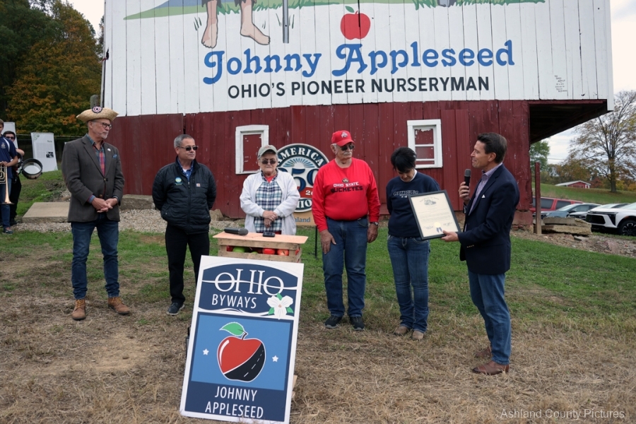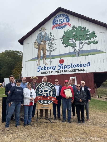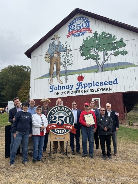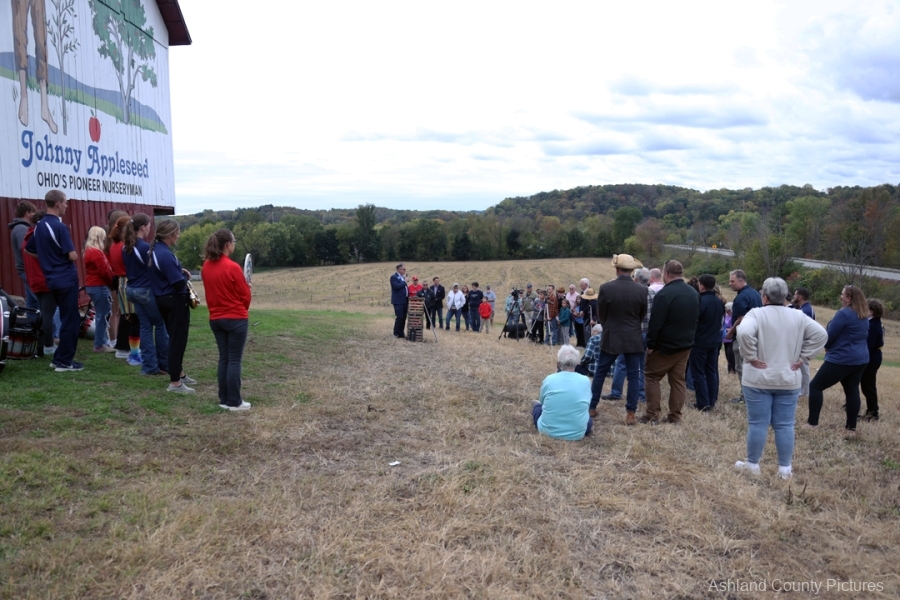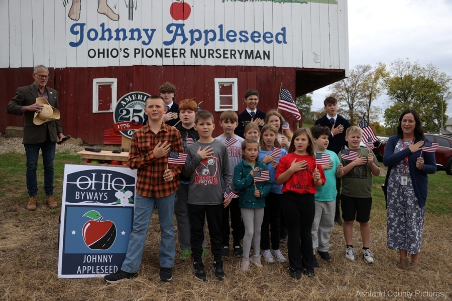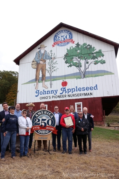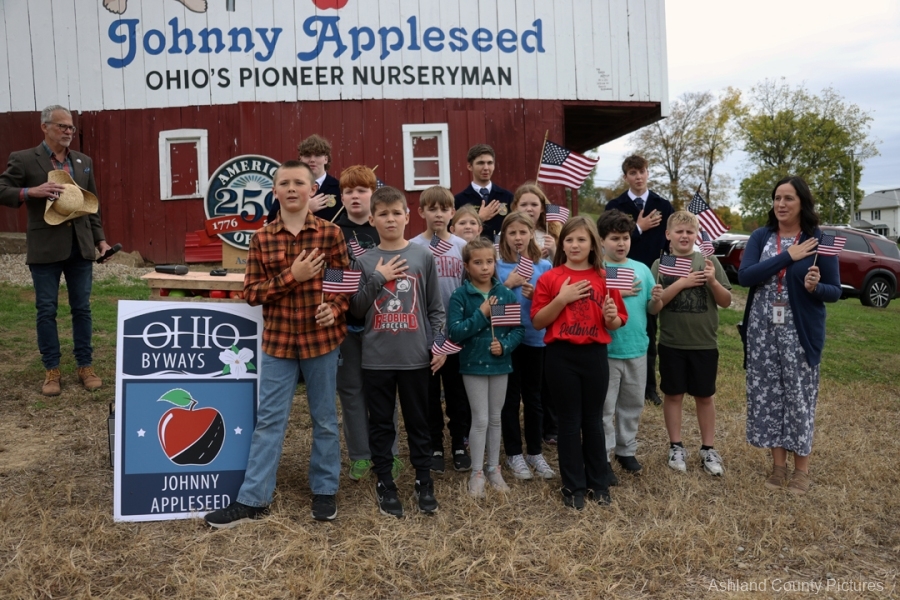 PERRYSVILLE, OH (Oct. 15, 2025) — With a rousing pledge from Loudonville-Perrysville fourth graders, a stirring rendition of “America the Beautiful” by the high school marching band, and cheers from a packed hillside crowd, Ashland County officially dedicated the Johnny Appleseed Barn Mural this afternoon on the Kline Farm—ground long tied to John Chapman’s life and legend.
