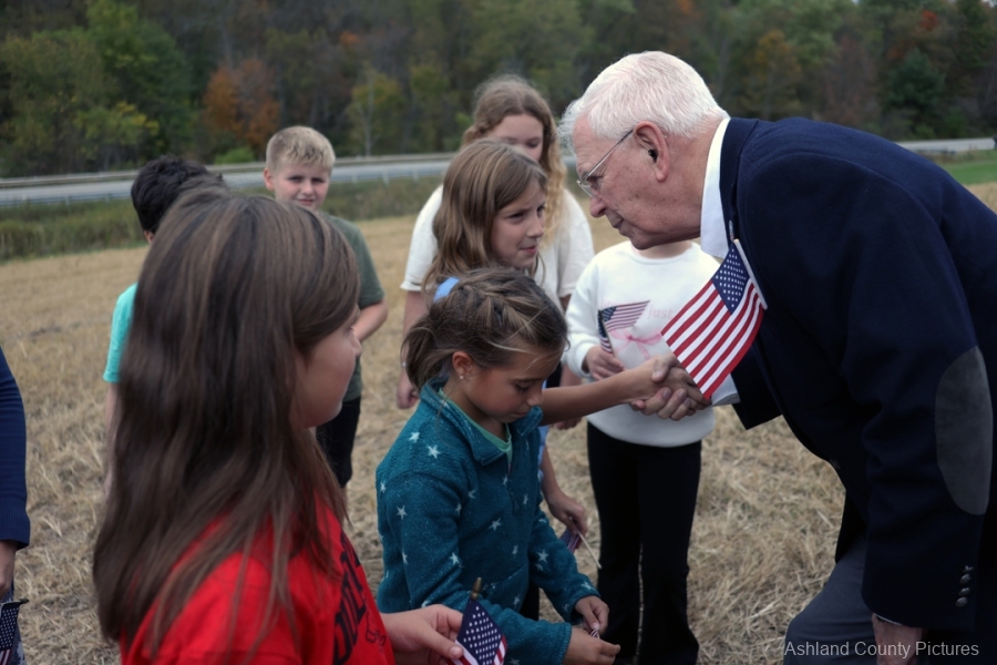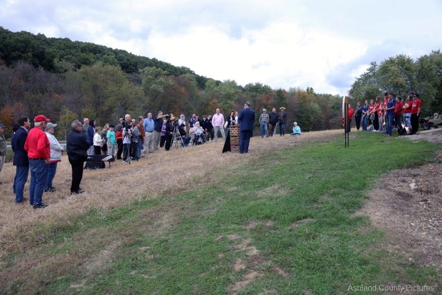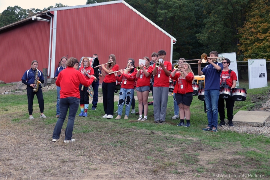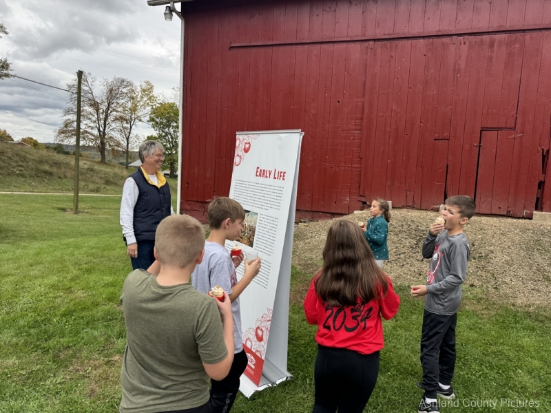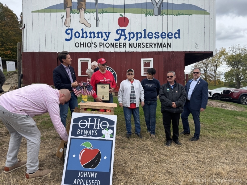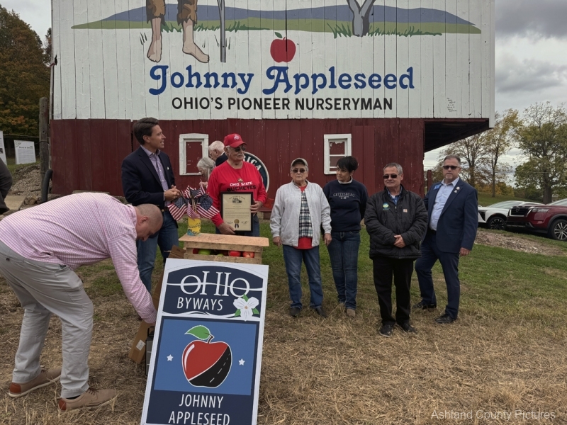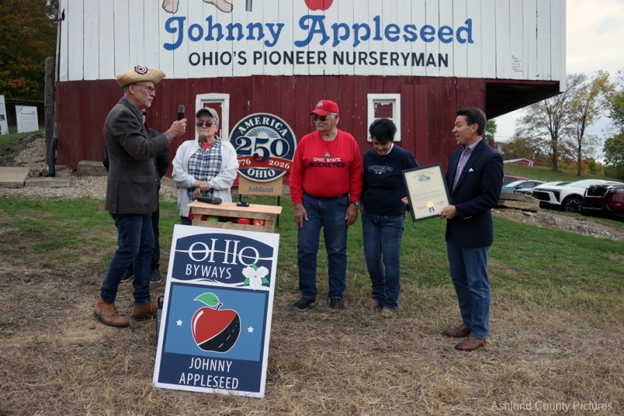PERRYSVILLE, OH (Oct. 15, 2025) — With a rousing pledge from Loudonville-Perrysville fourth graders, a stirring rendition of “America the Beautiful” by the high school marching band, and cheers from a packed hillside crowd, Ashland County officially dedicated the Johnny Appleseed Barn Mural this afternoon on the Kline Farm—ground long tied to John Chapman’s life and legend.