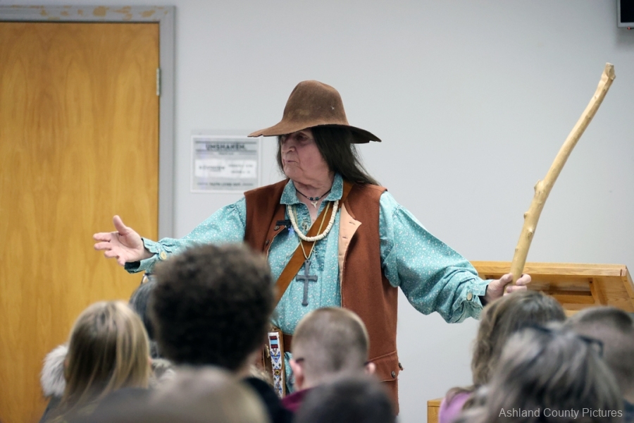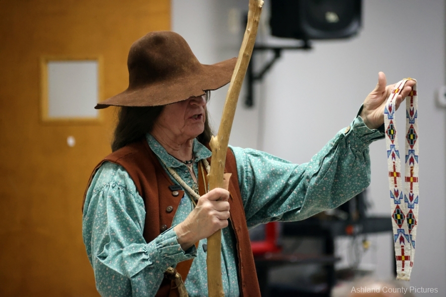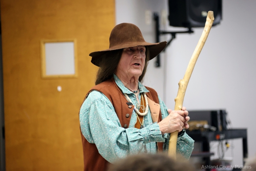 The speaker peppered the history with humor and bold opinions, warning people to stay out of “wicked” Mount Vernon, teasing the crowd about geography, and riffing on frontier life with lines that landed especially well with younger audience members.