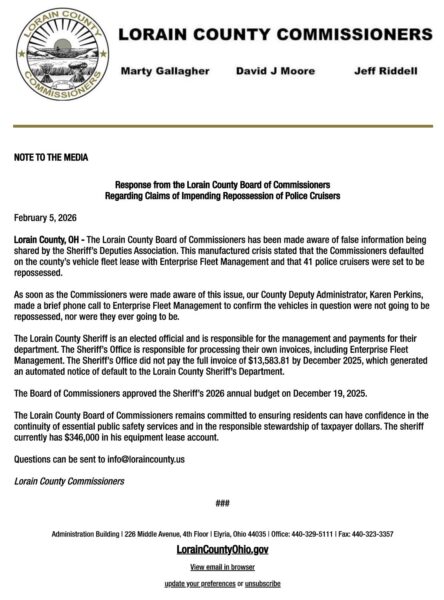 The response comes after the Lorain County Deputies Association issued a sharply worded press release earlier this week alleging that the commissioners had failed to pay more than $57,000 under a fleet lease agreement, placing dozens of patrol vehicles at risk. The association claimed deputies had already begun removing equipment and personal gear from cruisers in anticipation of repossession and questioned how the Sheriff’s Office could continue responding to calls without vehicles.