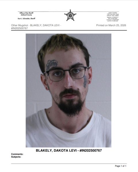 Court records show Blakely appeared for a bond hearing on March 16, 2026, where bond was set at $7,500 (10% permitted) in Ashland County Common Pleas Court.
