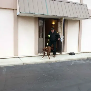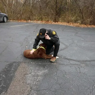 During the standoff, Law Enforcement Officers discovered a Chocolate Lab Mix in Geaslen’s hotel room. They promptly reached out to Joe Eggerton, the Ashland County Dog Warden, for assistance. As Eggerton guided the dog out of the Hotel, it suddenly collapsed and experienced a seizure. Eggerton quickly took action, assessing the dog for any injuries and contacting the Claremont Veterinary Clinic for immediate emergency care.