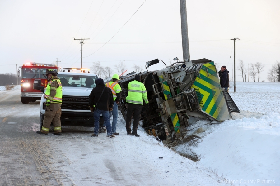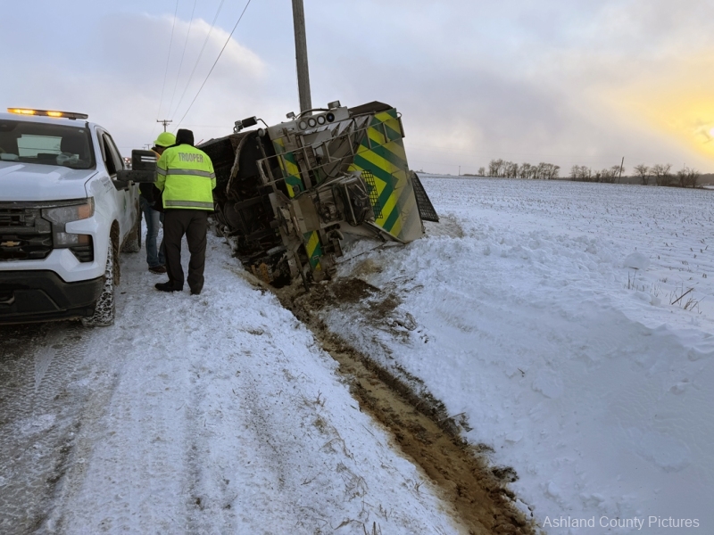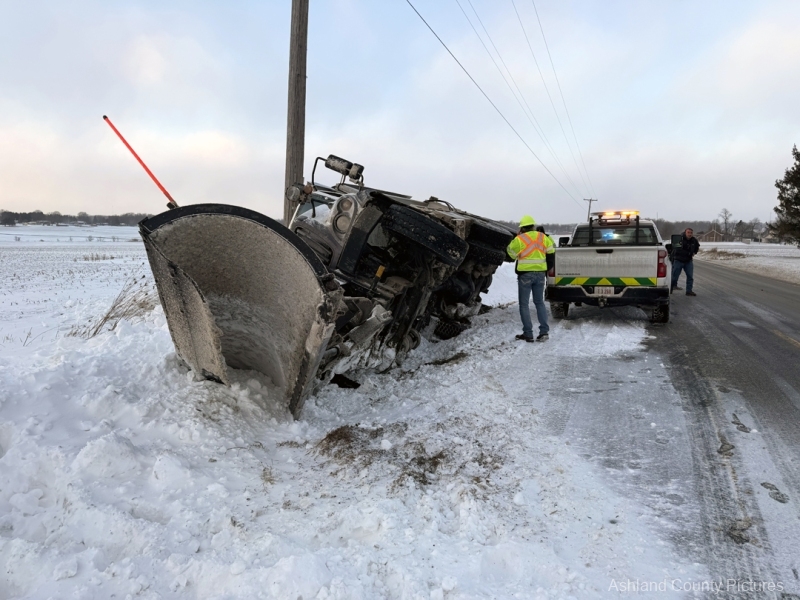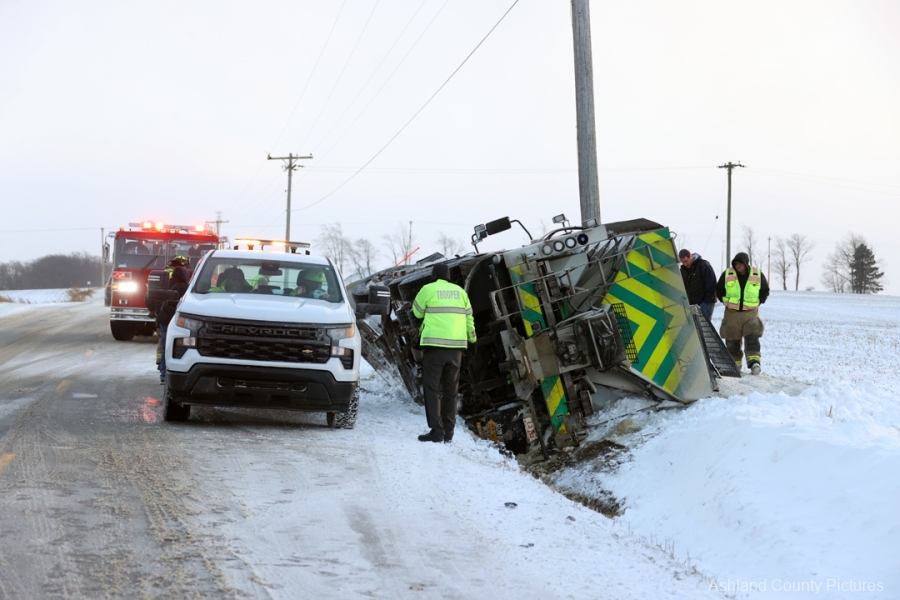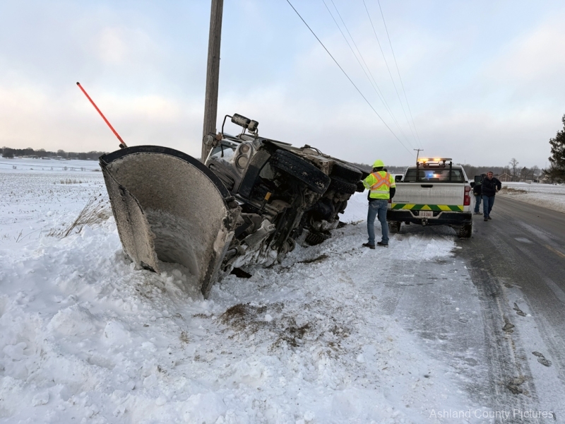 ASHLAND COUNTY, Ohio — Emergency crews responded to a rollover crash involving a ODOT snowplow truck Monday evening on State Route 511, which also resulted in damage concerns to a nearby utility pole.