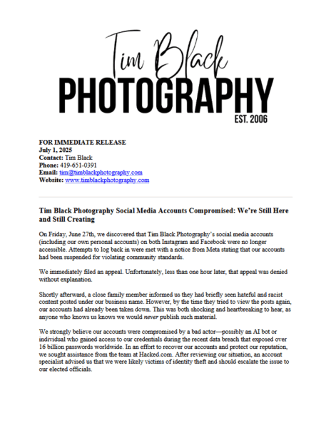 As the business works to resolve the issue, Tim Black Photography wants to reassure the public and its loyal clientele that it is still fully operational. Although the company’s social media presence is currently offline, services remain uninterrupted and can be accessed through the website: www.timblackphotography.com.