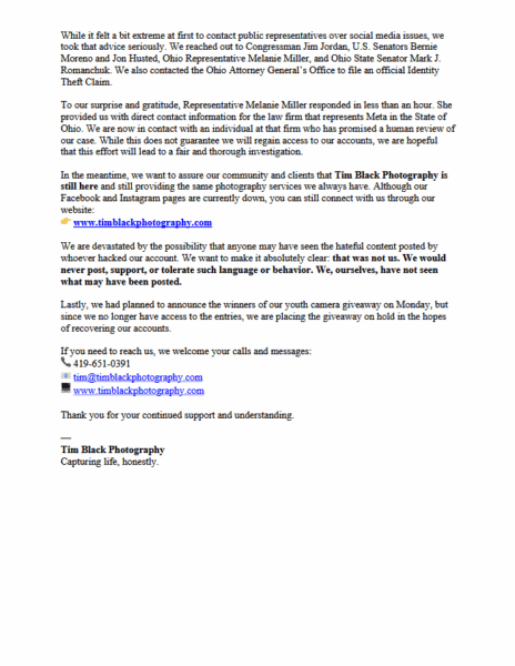 To their surprise, Rep. Melanie Miller responded within the hour and provided direct contact information for the Ohio law firm representing Meta. Tim Black Photography is now working with a representative from that firm who has promised a human review of the case.